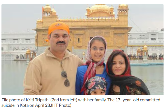 पड़ताल में आगे हमने संबंधित कीवर्ड की मदद से सर्च किया। इस दौरान हमें 10 मई, 2016 को प्रकाशित हिन्दुस्तान टाइम्स की एक रिपोर्ट मिली, जिसके मुताबिक 28 अप्रैल 2016 को कोटा में 17 वर्षीय कृति त्रिपाठी ने एक पांच मंजिला इमारत से कूदकर आत्महत्या कर ली थी। आत्महत्या करने से पहले कृति ने पांच पन्नों का भावुक सुसाइड नोट लिखा था। जिसमें उसने भारत सरकार और मानव संसाधन विकास मंत्रालय से जल्द से जल्द कोचिंग संस्थानों को बंद करने का आग्रह किया। कृति ने लिखा कि “जितना जल्दी हो सके, कोचिंग इंस्टीट्यूट्स को बंद कर दें, क्योंकि वे लोगों को चूस लेते हैं।”