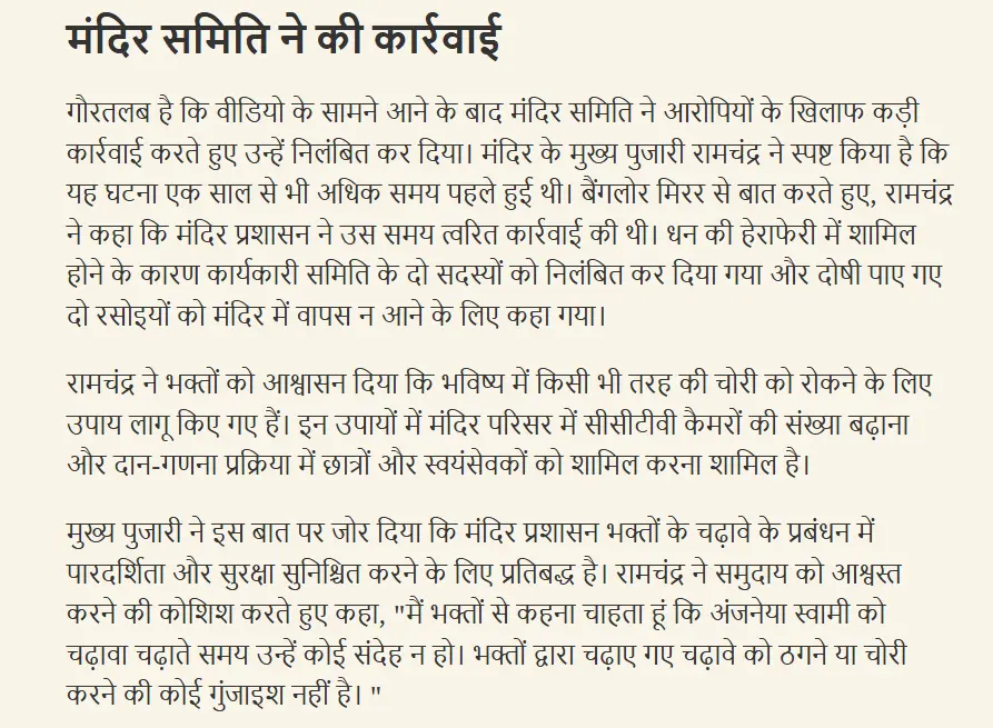 रिपोर्ट में आगे बताया गया है कि मुख्य पुजारी रामचंद्र ने स्पष्ट किया कि यह घटना एक साल से भी पहले हुई थी। रामचंद्र ने कहा कि मंदिर प्रशासन ने उस समय तुरंत कार्रवाई की थी। धन की हेराफेरी में शामिल दो कार्यकारी समिति के सदस्यों को निलंबित कर दिया गया और दो रसोइयों को मंदिर में वापस न आने के लिए कहा गया। रामचंद्र ने भक्तों को आश्वस्त किया कि भविष्य में किसी भी चोरी को रोकने के लिए उपाय लागू किए गए हैं, जिसमें मंदिर परिसर में सीसीटीवी कैमरों की संख्या बढ़ाना और दान-गणना प्रक्रिया में छात्रों और स्वयंसेवकों को शामिल करना शामिल है।