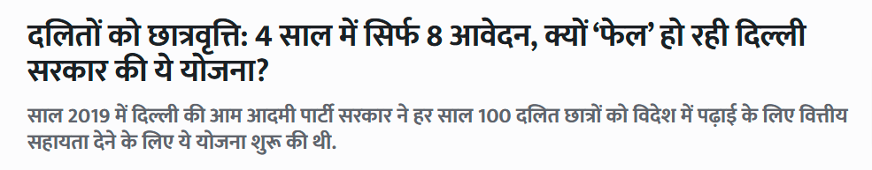 पड़ताल में हमें 4 अगस्त 2019 को प्रकाशित नवभारत टाइम्स की एक रिपोर्ट मिली। जिससे मालूम हुआ कि केजरीवाल ने साल 2019 में दलितों छात्रों को विदेश में पढ़ाई के लिए वित्तीय सहायता देने के लिए ऐसी ही एक योजना शुरू की थी। इस योजना के तहत हर साल 100 दलित छात्रों को विदेश में पढ़ाई के लिए आर्थिक मदद उपलब्ध करवाने का था।