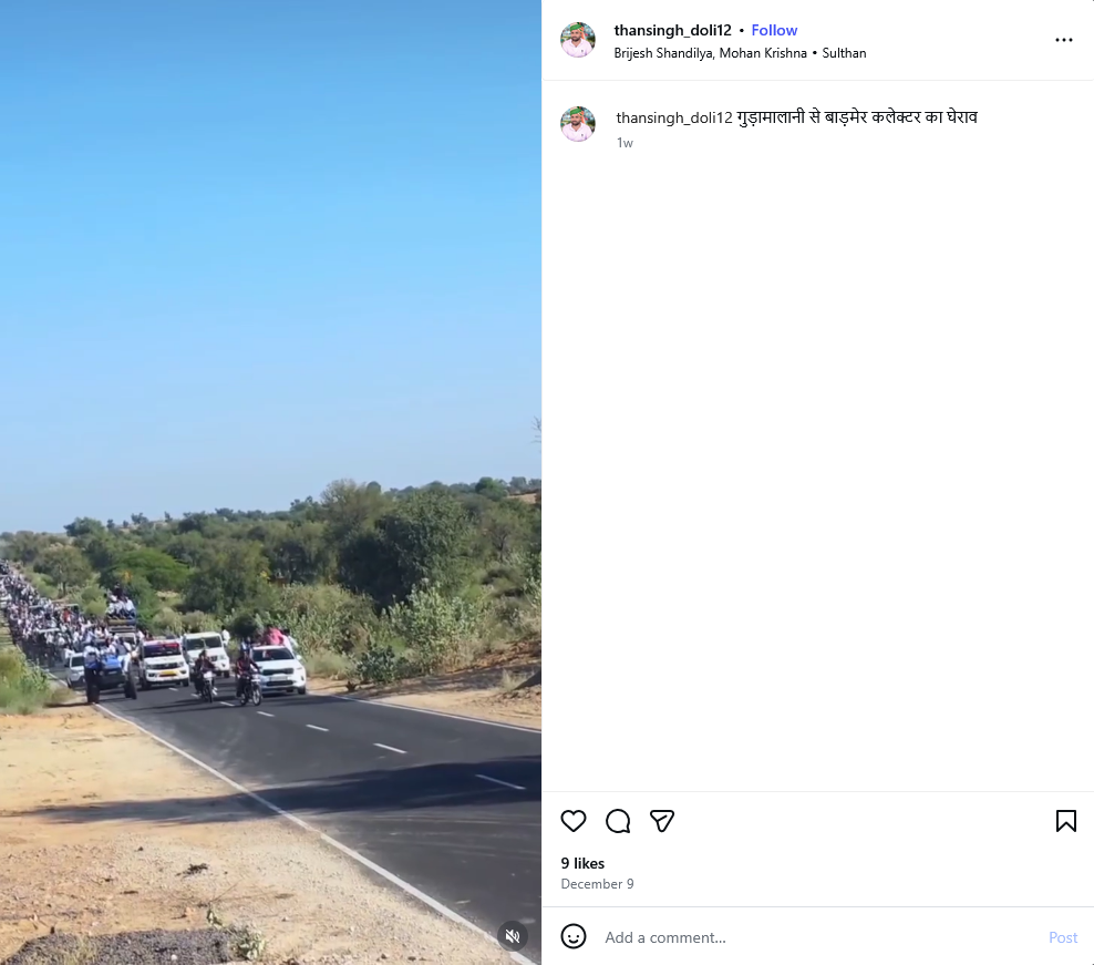 दावे की पड़ताल में वायरल वीडियो के स्क्रीनशॉट को गूगल रिवर्स सर्च करने पर यह वीडियो हमें 9 दिसंबर 2025 को thansingh_doli12 नाम के इंस्टाग्राम पेज पर पोस्ट मिला। वीडियो के कैप्शन में इसे ‘गुड़ामालानी से बाड़मेर कलेक्टर का घेराव’ बताया गया है। (Archive Link)