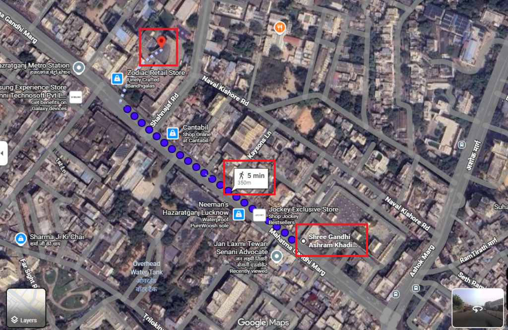 रील में बताया गया है कि लखनऊ के हजरतगंज में जहां लोग एक तरफ क्रिसमस मना रहे थे वहीं दूसरी तरफ लोग भजन कर रहे थे। लेकिन जब हमने गूगल पर वीडियो में ‘श्री गाँधी आश्रम खादी’ की बिल्डिंग के सामने भजन करते लोगों और सेंट जोसेफ कैथेड्रल चर्च की दूरी नापी तो पता चला कि दोनों के बीच 350 मीटर का फासला है। जिससे स्पष्ट है कि वायरल वीडियो में लोग चर्च के सामने भजन नहीं कर रहे थे।