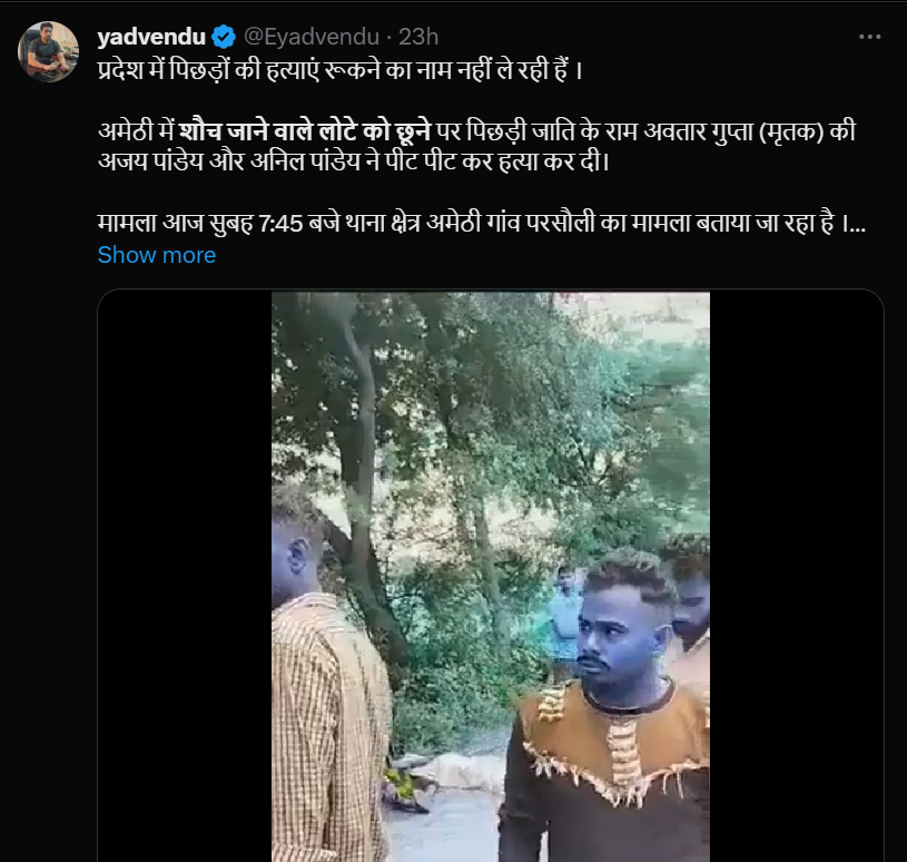 काशिफ अरसलान एक्स पर लिखा, “उत्तरप्रदेश – अमेठी, शौच में इस्तेमाल होने वाले लोटे को छूने पर पिछड़ी जाति के “राम अवतार गुप्ता” की ब्राह्मण जाती के दो सगे भाइ “अजय पांडेय & अनिल पांडेय” ने पीट पीट कर हत्या कर दी। जब इन्हें मुस्लमानों के विरुद्ध उग्र करना हो या वोट चाहिए हो तो दलित, आदिवासियों को हिंदू बता कर इस्तेमाल करते है, मगर आम ज़िन्दगी में इनके साथ जानवरों से भी बत्तर सुलूक करते हैं।”