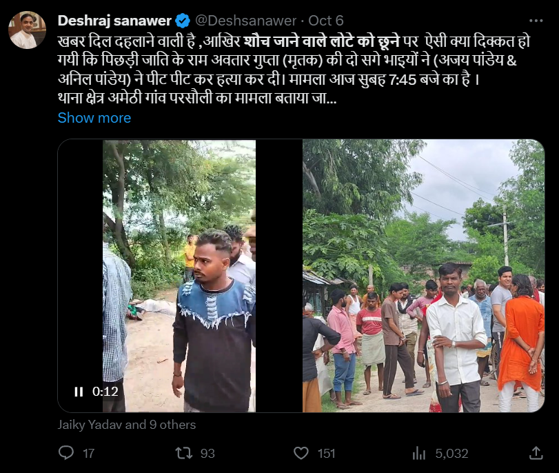 | दावा | अमेठी में लोटा छूने पर ब्राह्मणों ने की पिछड़ी जाति के युवक की हत्या |