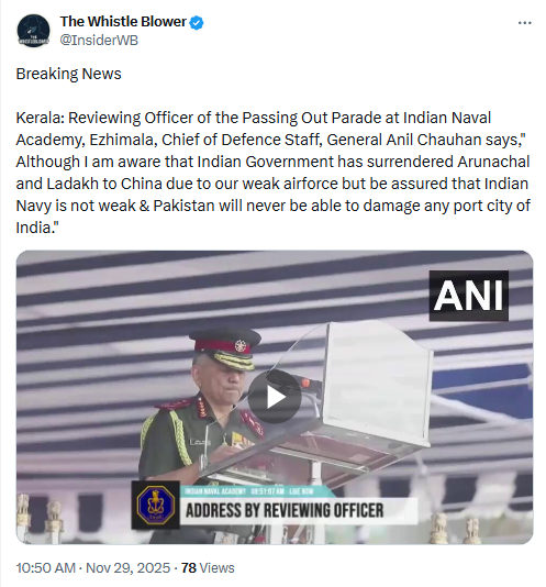 The Whistle Blower ने लिखा, ‘ब्रेकिंग न्यूज़ केरल: इंडियन नेवल एकेडमी, एझिमाला में पासिंग आउट परेड के रिव्यूइंग ऑफिसर, चीफ ऑफ डिफेंस स्टाफ, जनरल अनिल चौहान ने कहा, “हालांकि मुझे पता है कि भारत सरकार ने हमारी कमजोर एयरफोर्स की वजह से अरुणाचल और लद्दाख चीन को सौंप दिया है, लेकिन भरोसा रखें कि इंडियन नेवी कमजोर नहीं है और पाकिस्तान कभी भी भारत के किसी भी पोर्ट सिटी को नुकसान नहीं पहुंचा पाएगा।’
