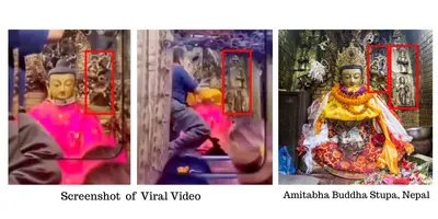 दावे की जांच के दौरान हमने वायरल वीडियो के कीफ्रेम को रिवर्स सर्च किया। इस दौरान स्वयंभू स्तुप नाम की वेबसाइट पर वायरल वीडियो में दिख रही बुद्ध की मूर्ति से मिलती जुलती एक तस्वीर मिली। वेबसाइट के मुताबिक स्वयंभू स्तुपा नेपाल के काठमांडू में है, जहां यह अमिताभ बुद्ध की मूर्ति स्थित है। वायरल वीडियो में दिख रही मूर्ति और अमिताभ बुद्ध की मूर्ति का मिलान करने पर हमें दोनों की तस्वीरों में कई समानताएं दिखीं। जैसे वायरल वीडियो में दिख रही मूर्ति और अमिताभ बुद्ध की मूर्ति के बगल में बनी नक्काशी एक है।