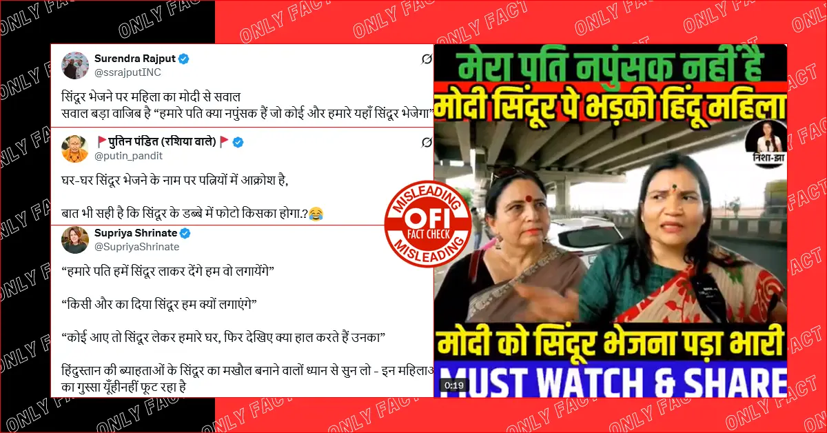 | 41- सिंदूर बाँटने के विवाद में भाजपा पर निशाना साधने वाली महिला ‘आप’ कार्यकर्ता है | देश की आम महिलाएं सरकार की ‘घर-घर सिंदूर वितरण योजना’ का विरोध कर रही हैं। | वायरल वीडियो में दिखाई दे रही महिला आम आदमी पार्टी की कार्यकर्ता है और ‘घर-घर सिंदूर वितरण’ की योजना की खबर आधारहीन है। |