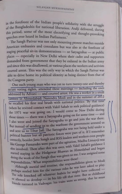 वरिष्ठ पत्रकार नीलांजन मुखोपाध्याय ने इकोनॉमिक टाइम्स पर 2015 में प्रकाशित अपने आर्टिकल में बांग्लादेश के लिए सत्याग्रह में नरेंद्र मोदी की मौजूदगी का जिक्र किया है। उन्होंने लिखा कि नरेंद्र मोदी 1971 में अटल बिहारी वाजपेयी की अगुवाई में दिल्ली में जनसंघ के सत्याग्रह में शामिल हुए थे, मोदी को थोड़े समय के लिए तिहाड़ जेल में रखा गया था।