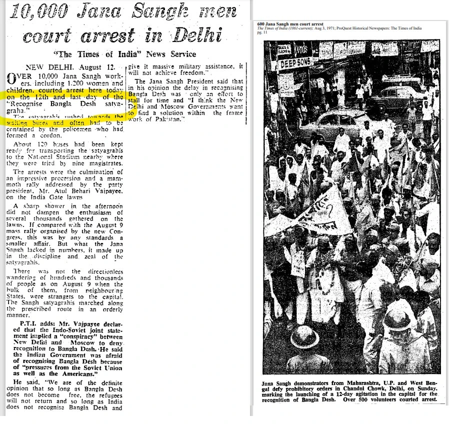 दावे की पड़ताल के लिए हमने कुछ कीवर्ड की मदद से गूगल सर्च किया। इस दौरान हमें टाइम्स ऑफ इंडिया के अंग्रेजी अखबार छपा एक लेख मिला, जिसमें बताया गया था कि जनसंघ ने अगस्त 1971 में बांग्लादेश सत्याग्रह शुरू किया था। उस समय अटल बिहारी वाजपेयी जनसंघ के अध्यक्ष थे, जिन्होंने सत्याग्रह को संबोधित किया था। सत्याग्रह आंदोलन 12 दिनों तक चला था। इस दौरान हजारों जनसंघ कार्यकर्ताओं को गिरफ्तार किया गया और सत्याग्रह के आखिरी दिन 1200 महिलाओं और बच्चों समेत करीब 10 हजार कार्यकर्ताओं को जेल में डाल दिया गया।