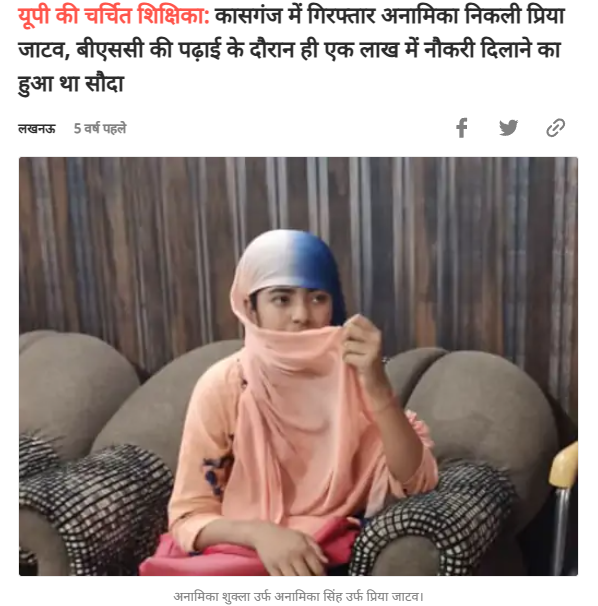पड़ताल में आगे हमें 2 जून 2022 को प्रकाशित हिंदुस्तान की एक रिपोर्ट मिली। जिसके मुताबिक फर्जी दस्तावेजों के माध्यम से कस्तूरबा विद्यालय बछरावां में शिक्षिका की नौकरी करने वाली फर्जी शिक्षिका अनामिका को पुलिस ने गिरफ्तार कर लिया है। अनामिका शुक्ला के नाम से नौकरी करने वाली महिला का असली नाम मंजेश कुमारी उर्फ अंजली है। दैनिक भास्कर की एक रिपोर्ट के मुताबिक उत्तर प्रदेश पुलिस ने इस मामले में एक और अन्य महिला को कासगंज से गिरफ्तार किया था। अनामिका के नाम से नौकरी करने वाली महिला का असली नाम प्रिया जाटव है। हालंकि abp न्यूज़ की रिपोर्ट के मुताबिक़ पुलिस ने जब इस महिला से सख्ती से पूछताछ की तो उसने अपना असली नाम सुप्रिया जाटव बताया।