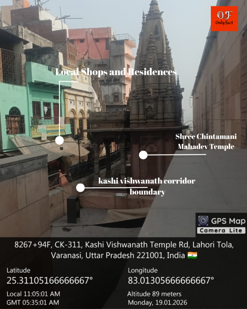 पड़ताल में आगे हम श्री काशी विश्वनाथ कॉरिडोर पहुंचे जहां हमें मणिकर्णिका घाट के किनारे श्री चिंतामणि महादेव मंदिर सही सलामत अवस्था में मिला। मंदिर के आसपास भी किसी प्रकार का ध्वस्तीकरण का कार्य नहीं चल रहा है।