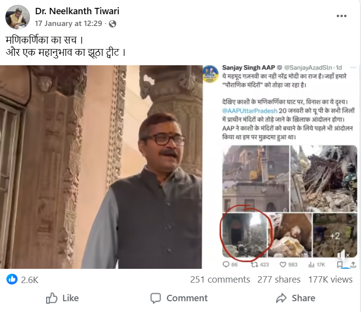 सोशल मीडिया पर वाराणसी में मणिकर्णिका घाट को तोड़ने की कई तस्वीरें वायरल हो रही हैं। इसी के साथ एक मंदिर की तस्वीर भी वायरल है। जिसमें मंदिर के सामने नंदी की मूर्ति दिख रही है। साथ ही मंदिर के आप-पास मलबा पड़ा नजर आ रहा है। इस तस्वीर को एक्स पर शेयर कर दावा किया जा रहा है कि काशी के मणिकर्णिका घाट पर मंदिर को तोड़ दिया गया है।