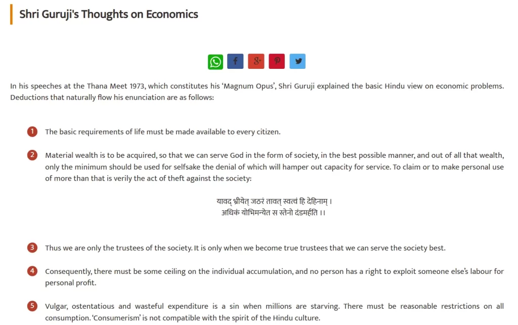 इस पड़ताल को आगे बढ़ाते हुए, हमने यह जानने की कोशिश की कि गोलवलकर का देश की संपत्ति और संसाधनों को लेकर क्या दृष्टिकोण था। इस दौरान हमें Golwalkarguruji वेबसाइट पर उनके विचारों से संबंधित जानकारी मिली। गोलवलकर का मानना था कि,‘धन-संपत्ति का उपयोग समाज की सेवा के लिए होना चाहिए, न कि केवल व्यक्तिगत लाभ के लिए। हमें अपनी आवश्यकताओं के अनुसार ही संपत्ति का उपयोग करना चाहिए, क्योंकि यदि हम अपनी मूल आवश्यकताओं को पूरी तरह नज़रअंदाज करेंगे, तो समाज की सेवा करने की हमारी क्षमता भी प्रभावित होगी। जरूरत से ज्यादा संपत्ति अपने लिए रखना समाज के साथ अन्याय करने जैसा है।’