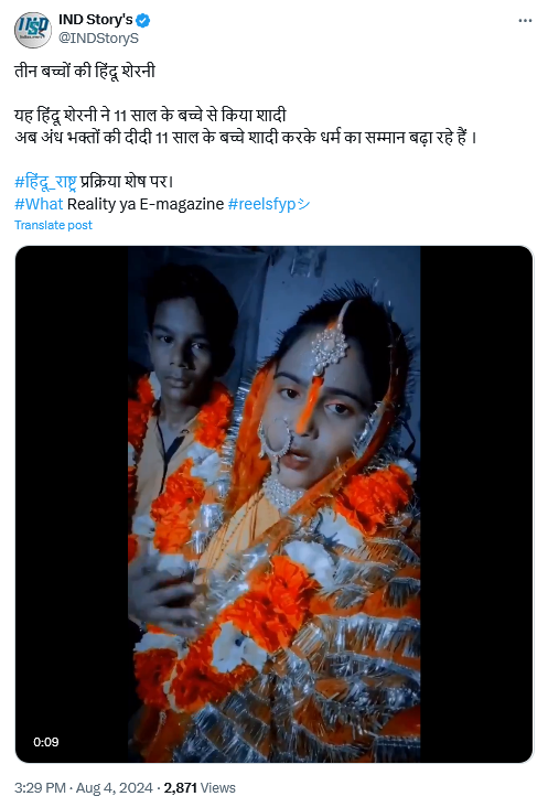| 15. हिंदू महिला द्वारा मामा के लड़के से शादी का वीडियो स्क्रिप्टेड है | तीन बच्चों की मां ने 11 साल के मामा के लड़के से शादी की। | हिंदू महिला द्वारा मामा के लड़के से शादी का वीडियो स्क्रिप्टेड है। वीडियो में दिख रही महिला एक कंटेंट क्रिएटर है। |