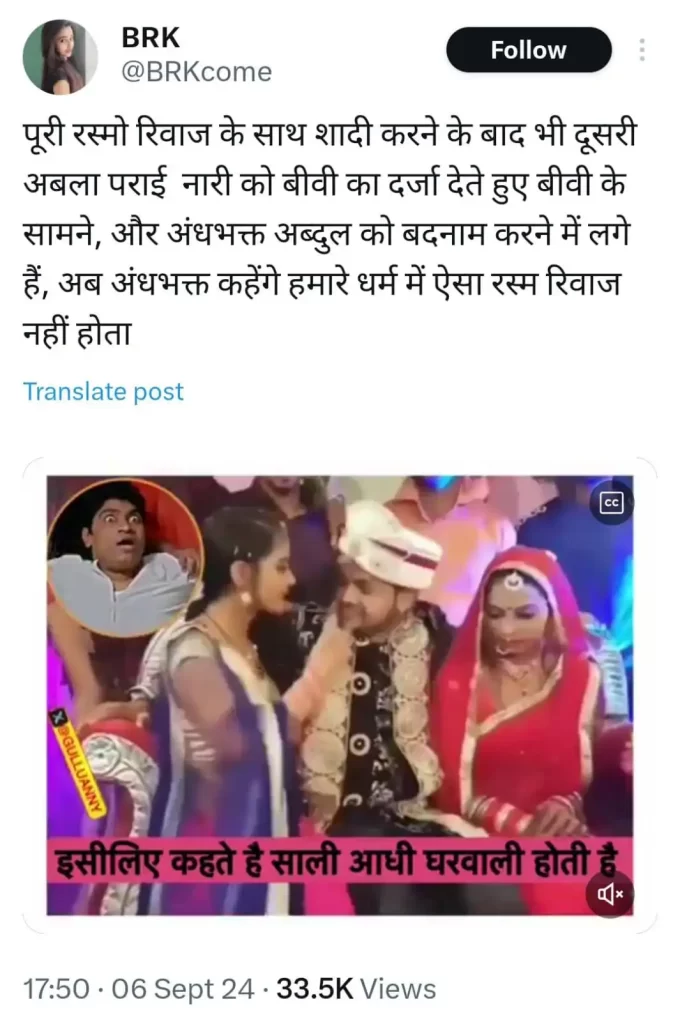 | 12. ब्राह्मण युवक ने 5 महिलाओं के साथ नहीं की शादी, वायरल वीडियो स्क्रिप्टेड है | ब्राह्मण युवक ने 5 महिलाओं के साथ शादी की। | यह विडियो स्क्रिप्टेड है, वीडियो में नजर आ रहा शख्स ब्रजेश तिवारी एक सोशल मीडिया इन्फ्लुएंसर है। यह वीडियो मनोरंजन के उद्देश्य से बनाई गयी है। |