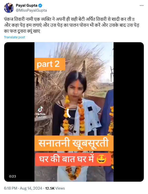 | 17. बाप बेटी की शादी का वायरल वीडियो स्क्रिप्टेड है | पंकज तिवारी नामी एक व्यक्ति ने अपनी ही सही बेटी अर्पित तिवारी से शादी कर ली। | यह वीडियो स्क्रिप्टेड है। इसे केवल मनोरंजन के उद्देश्य से बनाया गया है। इसका वास्तविकता से कोई लेना देना नहीं है। |