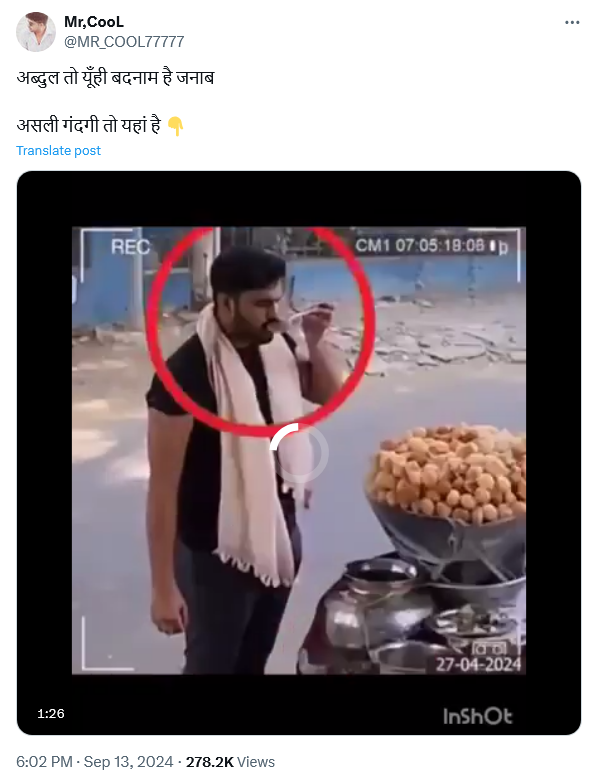| 19. गोलगप्पों को जूठा कर बेचने का वायरल वीडियो स्क्रिप्टेड है | हिंदू दूकानदार ने ग्राहकों को जूठे पानी से बने गोलगप्पे खिलाये। | यह वीडियो स्क्रिप्टेड है। इस वीडियो को स्व्च्छता के प्रति जागरूकता के उद्देश्य से बनाया गया है। |