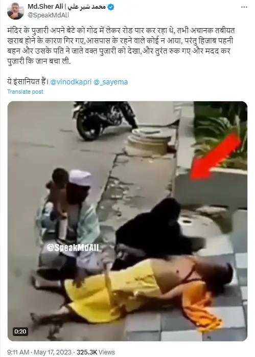 | 10. मुस्लिम दंपति द्वारा पुजारी की मदद का वीडियो स्क्रिप्टेड है | मुस्लिम दंपति ने पुजारी की मदद की। | वीडियो के किरदार यानी पुजारी, बच्चा, मुस्लिम दंपति यह सब एक नाटक है। वीडियो को असल जिंदगी से कोई लेना देना नहीं है। वास्तविकता में कोई मुस्लिम दंपति किसी पुजारी को जान से नहीं बचाया है। यह वीडियो स्क्रिप्टेड है। |