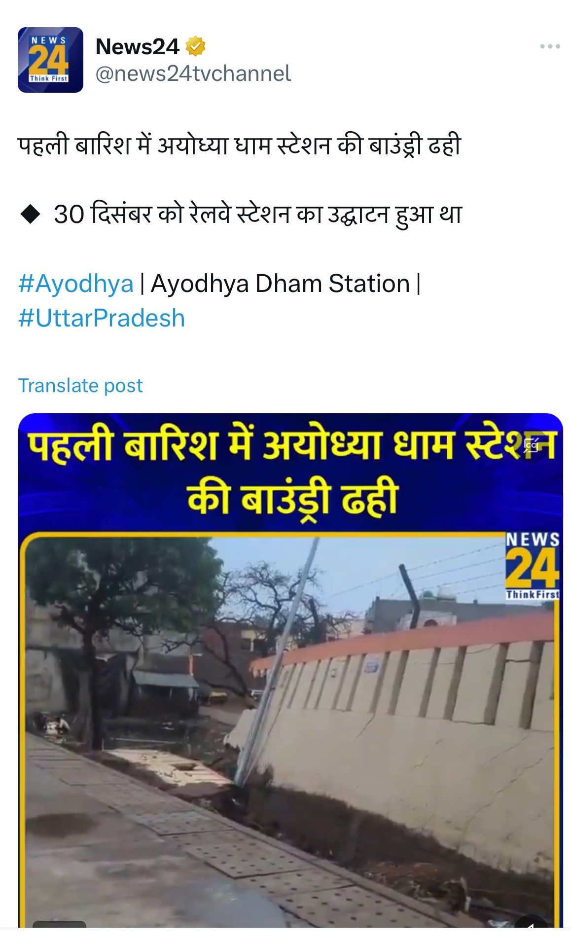 | 16. पहली बारिश में अयोध्या धाम रेलवे स्टेशन की बाउंड्री वॉल ढह गई? | पहली बारिश में अयोध्या धाम स्टेशन की बाउंड्री वॉल ढही गई। | अयोध्या धाम रेलवे स्टेशन पर गिरी बाउंड्री वॉल स्टेशन का मुख्य हिस्सा नहीं है बल्कि रेलवे और निजी भूमि के बीच की दीवार है। निजी भूमि पर खुदाई और जलभराव के कारण यह बाउंड्री वॉल गिरी है। |