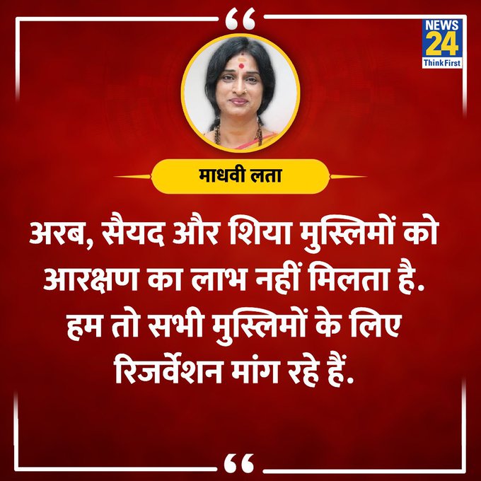 | 19. माधवी लता ने मुस्लिम आरक्षण का समर्थन नहीं किया | माधवी लता ने कहा, अरब, सैयद और शिया मुस्लिमों को आरक्षण का लाभ नहीं मिलता। हम तो सभी मुस्लिमों के लिए रिजर्वेशन मांग रहे हैं। | माधवी लता ने किसी भी मंच पर ऐसा कुछ नहीं कहा है। उनके द्वारा मुस्लिम आरक्षण का समर्थन करने का दावा गलत है। |