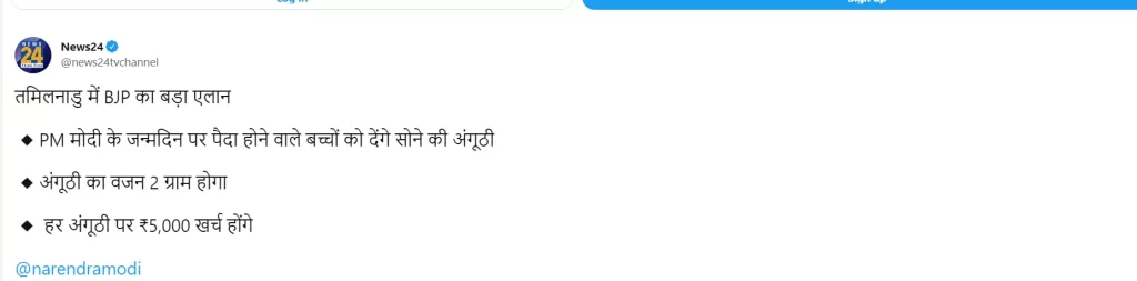 | 10. तमिलनाडु में पीएम मोदी के जन्मदिन पर पैदा होने वाले बच्चों को मिलेगा सोने की अंगुठी? | तमिलनाडु में बीजेपी का बड़ा ऐलान, पीएम मोदी के जन्मदिन पर पैदा होने वाले बच्चों को देंगे सोने की अंगूठी। | बीजेपी में पूरे तमिलनाडु में ऐसा ऐलान नहीं किया था। बीजेपी ने सिर्फ चेन्नई के आरएसआरएम अस्पताल में पीएम मोदी के जन्मदिन के दिन पैदा होने वाले 10-15 बच्चों को सोने की अंगूठी बांटने की घोषणा की थी। |