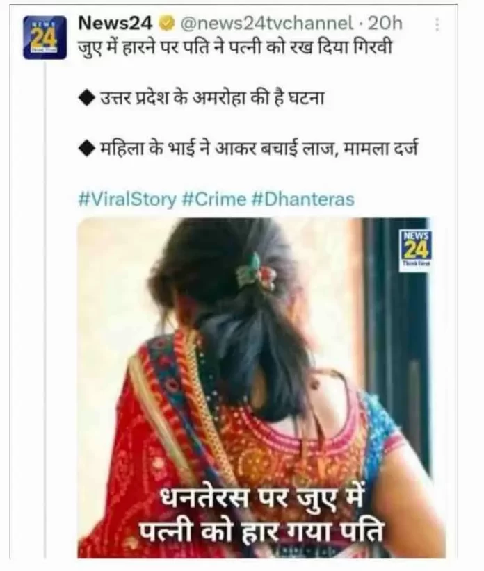 | 14. धनतेरस पर जुए में हारने के बाद पति द्वारा पत्नी को गिरवी रखने का दावा भ्रामक | उत्तरप्रदेश के अमरोहा में जुए में हारने पर पति ने पत्नी को रख दिया गिरवी। | जुए में अपनी पत्नी को हारने वाला व्यक्ति हिंदू नहीं, बल्कि मुस्लिम समुदाय से है। ऐसे में उसका धनतेरस से कोई लेना देना नहीं था। |
