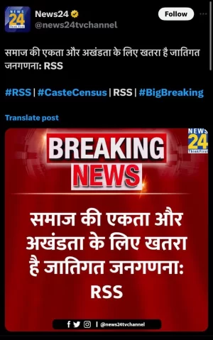 | 20. आरएसएस ने जातिगत जनगणना का विरोध नहीं किया | आरएसएस ने जातिगत जनगणना को समाज की एकता और अखंडता के लिए खतरा बताया है। | आरएसएस द्वारा जातिगत जनगणना का विरोध करने का दावा गलत है। आरएसएस ने जातिगत जनगणना का समर्थन करते हुए इसे चुनावी उद्देश्यों के बजाय कल्याणकारी उद्देश्यों के लिए किये जाने का सुझाव दिया है। |