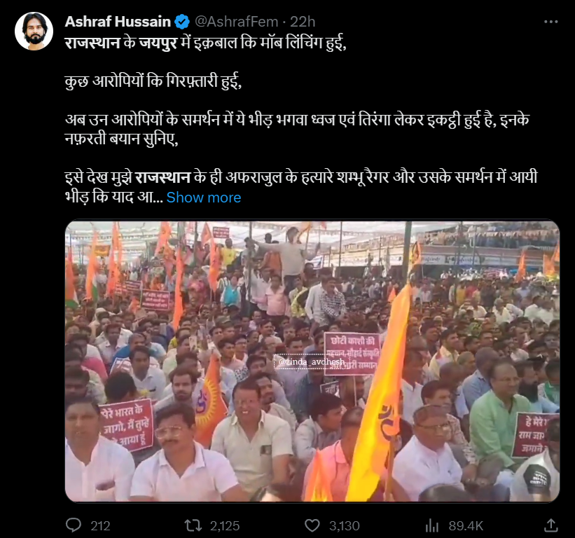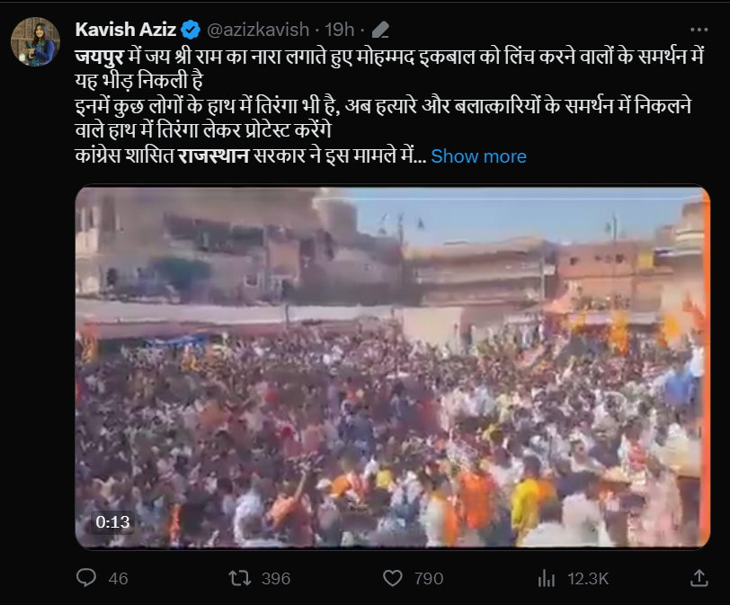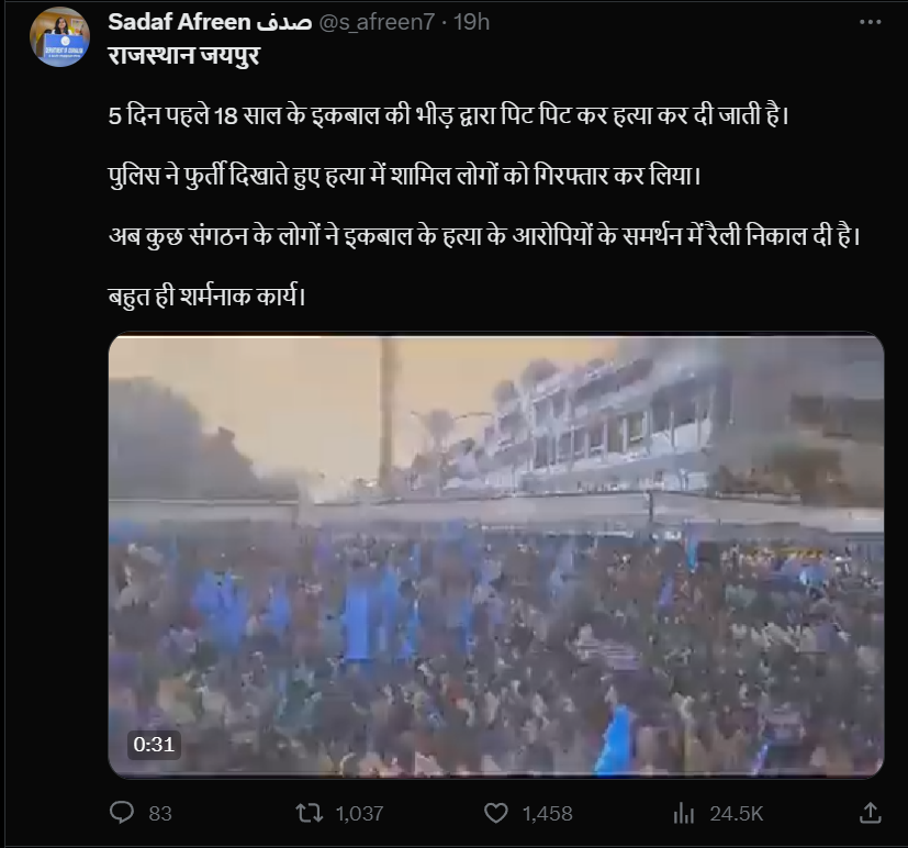एक्स पर इस वीडियो को शेयर करते हुए ‘वसीम अकरम त्यागी‘ ने लिखा, “ये हिंदूवादी संगठन के ‘मजदूर’ जयपुर में इकबाल के हत्यारोपियों के समर्थन में इकट्ठा हुए हैं। इक़बाल की नफ़रती भीड़ ने पीट-पीट कर हत्या कर दी थी। ये नफ़रत की इंतेहा है! कल को यह गैंग उस कुत्ते को भी माला पहना देगा जिसने किसी ‘उर्दू’ नाम वाले को काटा होगा।”