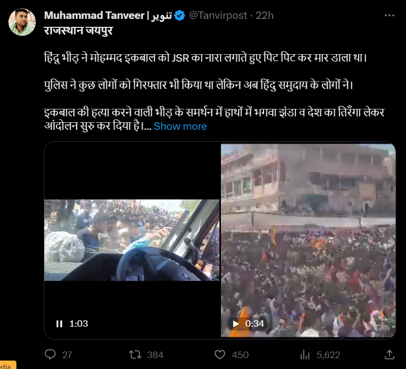 राजस्थान के जयपुर में पांच दिन पहले हुई युवक इकबाल की हत्या के बाद यह मामला लगातार तूल पकड़ता जा रहा है। सोशल मीडिया पर इस मामले से जोड़कर एक वीडियो शेयर किया जा रहा है। वीडियो में भगवा झंडा लिए एक भीड़ को देखा जा सकता है। दावा किया जा रहा है कि हिंदूवादी संगठन इकबाल के हत्यारों के समर्थन में इक्कठा हुए हैं। हालांकि, हमारी पड़ताल में यह दावा भ्रामक निकला।