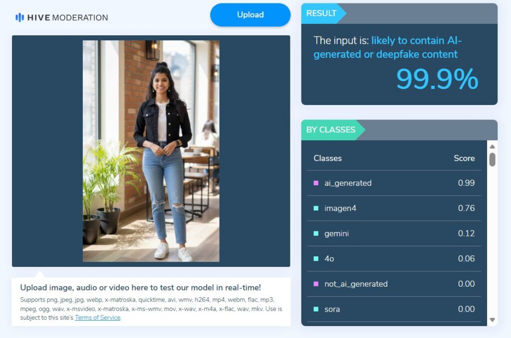 दावे की पड़ताल में वायरल तस्वीर को रिवर्स सर्च करने पर यह तस्वीर हमें मैथिलि ठाकुर के सोशल मीडिया या किसी भी अन्य विश्वसनीय वेबसाइट पर मौजूद नहीं मिली। पड़ताल में आगे हमें Hive AI टूल की मदद से तस्वीर की जांच कि तो पता चला कि यह तस्वीर AI जनरेटेड है।