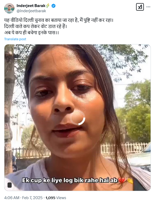 | 7. दिल्ली में ‘एक कप के लिए वोटर बिकने’ का दावा गलत है | यह वीडियो दिल्ली चुनाव का बताया जा रहा है, मैं पुष्टि नहीं कर रहा। दिल्ली वाले कप लेकर वोट डाल रहे हैं।अब ये कप ही बचेगा इनके पास। | पड़ताल से स्पष्ट है कि यह वीडियो भ्रामक दावे के साथ वायरल है। दिल्ली में मतदान के दौरान वोटर को खरीदने के लिए कप नही बांटे गये थे। चुनाव आयोग ने पिंक बूथ पर बुजुर्ग मतदाताओं और दिव्यांगों को सम्मानित करने के लिए गिफ्ट दिया था। |