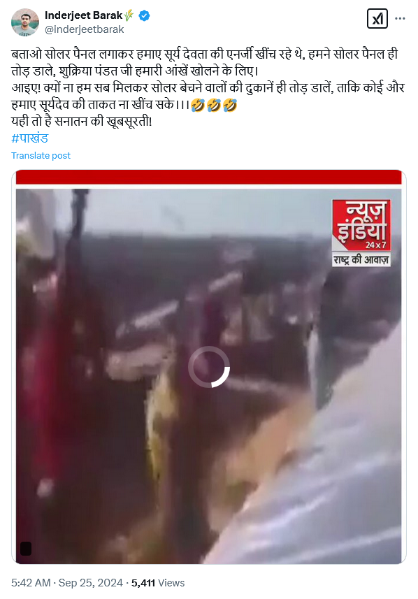 | 17. राज्यस्थान में पंडित की सलाह पर सोलर पैनल तोड़ने का दावा भ्रामक है | राजस्थान में एक पंडित के कहने पर सोलर को तोड़ दिया गया, क्योंकि पंडित का कहना था कि सोलर की एनर्जी से सूरज देवता को परेशानी होती है। | यह वीडियो साल 2018 का महाराष्ट्र का है, जब मजदूरी न मिलने पर वहां पर काम करने वाले मजदूरों ने विरोध प्रदशन के तौर पर सोलर पैनलतोड़ दिए थे। |