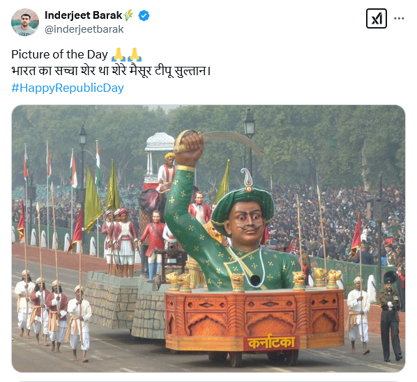 | 3. गणतंत्र दिवस परेड में टीपू सुल्तान की झांकी की तस्वीर दस साल पुराना है | गणतंत्र दिवस परेड में नज़र आया भारत का सच्चा शेर, शेर-ए-मैसूर टीपू सुल्तान था। | वायरल हो रही तस्वीर 26 जनवरी 2014 की है, जब गणतंत्र दिवस परेड में कर्नाटक की झांकी में टीपू सुल्तान को प्रदर्शित किया गया था। |