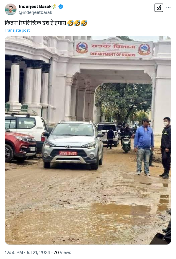 | 23. सड़क विभाग के ऑफिस के बाहर टूटे रोड की तस्वीर भारत की नहीं है | सड़क विभाग के बाहर टूटे हुए रास्ते की तस्वीर भारत की है। | यह तस्वीर भारत की नहीं, नेपाल की है। |