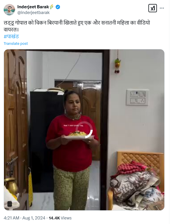 | 22. भगवान लड्डू गोपाल की प्रतिमा को नॉनवेज खिलाने का दावा गलत है | लड्डू गोपाल को चिकन बिरयानी खिलाते हुए एक और सनातनी महिला का वीडियो वायरल। | लड्डू गोपाल की प्रतिमा को नॉनवेज खिलाने का दावा गलत है। यूट्यूबर मौली चक्रवर्ती प्रतिमा को प्रसाद के रूप में आलू और पनीर से बनी शाकाहारी बिरयानी परोस रहीं थी। |