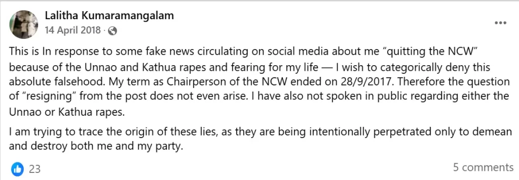 पड़ताल में आगे हमें वायरल स्टेटमेंट पर ललिता कुमार मंगलम का स्पष्टीकरण मिला। ललिता कुमार मंगलम ने 14 अप्रैल 2018 को फेसबुक पर एक पोस्ट कर बताया कि ‘उन्नाव और कठुआ में हुए गैंगरेप के खिलाफ इस्तीफा देने और इस घटना के खिलाफ बोलने पर मेरी जान को खतरा होने की खबर फर्जी है। एनसीडब्ल्यू के अध्यक्ष के रूप में मेरा कार्यकाल 28/9/2017 को समाप्त हो गया। इसलिए पद से इस्तीफा देने का सवाल ही नहीं उठता। मैं इन झूठों की उत्पत्ति का पता लगाने की कोशिश कर रही हूं, क्योंकि ये जानबूझकर मुझे और मेरी पार्टी दोनों को नीचा दिखाने के लिए फैलाए जा रहे हैं।’