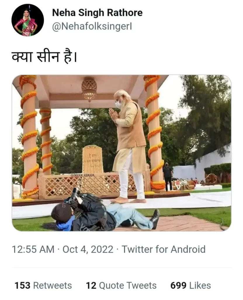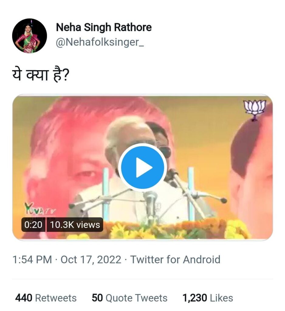 उत्तर प्रदेश चुनाव के समय ‘यूपी में का बा’ गाना काफी पॉपुलर हुआ। इस गाने की लोक गायिका नेहा सिंह राठौर चर्चा में आ गई। इसके बाद से नेहा ने अपने कई गानों से भाजपा की सरकारों की आलोचना की है, गानों के अलावा नेहा सोशल मीडिया पर भी सरकार को घेरने का कोई मौका नहीं चूकतीं।