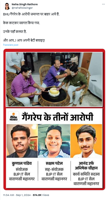 | 16. बीजेपी नेता द्वारा केक काटकर स्वागत करने का दावा गलत है | आईआईटी-बीएचयू गैंगरेप के आरोपियों को जमानत मिलने पर बीजेपी नेता द्वारा केक काटकर स्वागत किया। | आईआईटी-बीएचयू गैंगरेप के आरोपियों का बीजेपी नेता द्वारा केक काटकर स्वागत करने का दावा गलत है। वायरल तस्वीर करीबन 3 साल पुरानी हैं। |