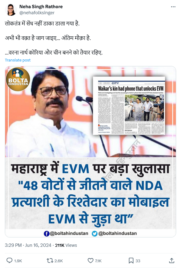 | 7. ओटीपी से EVM को अनलॉक करने का दावा गलत है | मुंबई नॉर्थ वेस्ट से मात्र 48 वोटों से जीते शिवसेना कैंडिडेट रवींद्र वायकर के एक रिश्तेदार के पास ईवीएम को अनलॉक करने वाला मोबाइल था। जिस पर ओटीपी आता था। | ईवीएम को अनलॉक करने के लिए मोबाइल फोन पर कोई ओटीपी की आवश्यकता नहीं होती, क्योंकि यह नॉन-प्रोग्रामेबल है और इसमें कोई वायरलेस संचार क्षमता नहीं है। |
