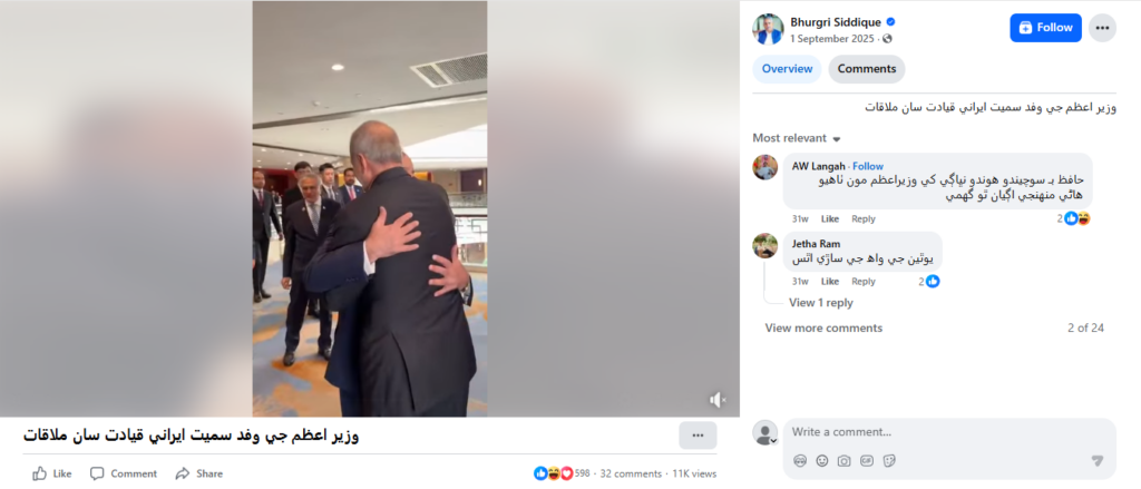 वायरल वीडियो की जांच के लिए हमने वीडियो के कीफ्रेम को रिवर्स सर्च किया। इस दौरान यह वीडियो हमें 1 सितंबर 2025 को भुर्ग्री सिद्दीक़ नाम के फेसबुक पेज पर पोस्ट मिला। जिसके कैप्शन में उर्दू में लिखा है, ‘प्रधानमंत्री के प्रतिनिधिमंडल सहित ईरानी नेतृत्व के साथ बैठक।’ वीडियो में ठीक 8 सेकेंड पर वायरल हिस्से को देखा जा सकता है।
