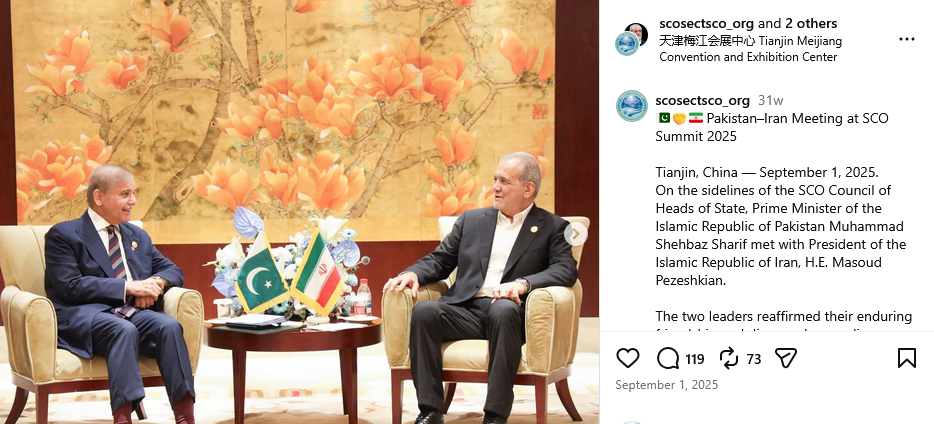 वहीं पड़ताल में हमें दोनों नेताओं की तस्वीर 1 सितंबर 2025 को Shanghai Cooperation Organization(SCO) के इंस्टाग्राम अकाउंट पर भी पोस्ट मिली। जिसके मुताबिक यह तस्वीर चीन के तियानजिन में आयोजित SCO Summit 2025 में पाकिस्तान और ईरान की मीटिंग की है।