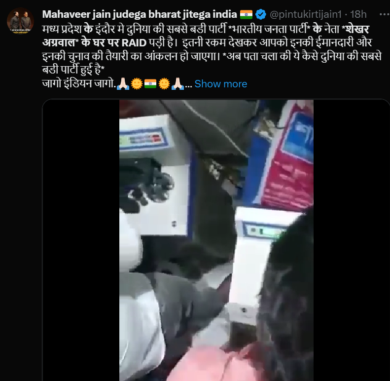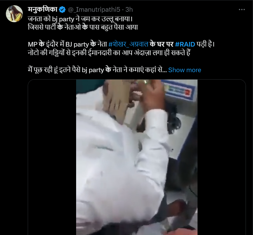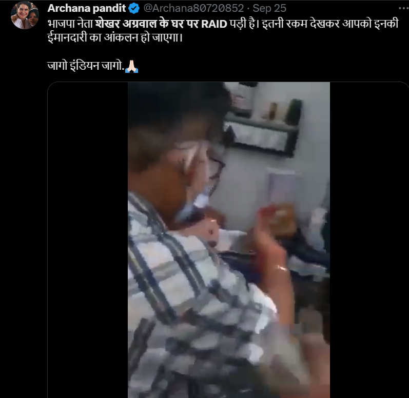 वहीं ‘India गठबंधन‘ नाम के अकाउंट ने लिखा, “भाजपा के काले कारनामें…….भाजपा नेता शेखर अग्रवाल के घर पर RAID पड़ी है। इतनी रकम देखकर आपको इनकी ईमानदारी का आंकलन हो जाएगा। जागो इंडियन जागो।”
