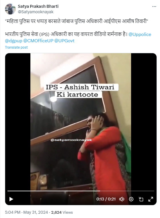 सत्य प्रकाश भारती ने लिखा, ‘महिला पुलिस पर थप्पड़ बरसाते जांबाज पुलिस अधिकारी आईपीएस आशीष तिवारी” भारतीय पुलिस सेवा (IPS) अधिकारी का यह वायरल वीडियो शर्मनाक है’