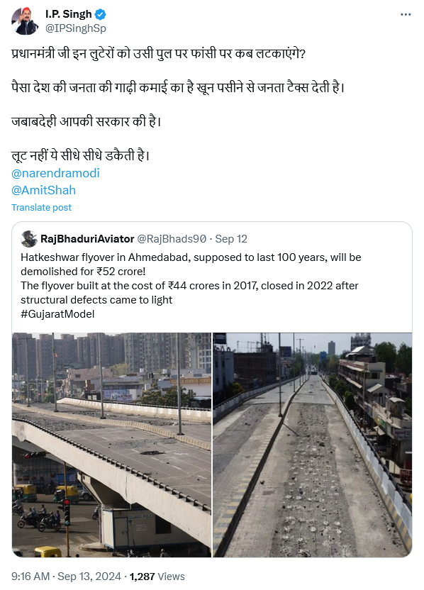 | 32. 52 करोड़ में अहमदाबाद के हाटकेश्वर ब्रिज को तोड़ने का दावा भ्रामक | गुजरात के अहमदाबाद में हाटकेश्वर ब्रिज को बनाने में 42 करोड़ खर्च किए गए थे! पर इस पूल को तोड़ने में 52 करोड़ का खर्च होगा। | अहमदाबाद में 42 करोड़ रुपये की लागत से बने हाटकेश्वर ब्रिज को 52 करोड़ रुपये में तोड़ने का दावा भ्रामक है। असल में 52 करोड़ में इस पुल को गिराकर फिर से बनाया जाएगा। |