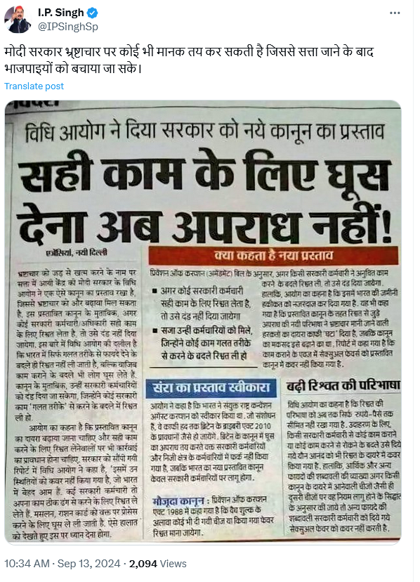 | 30. सही काम के लिए घूस लेना अपराध नहीं? 9 साल पुरानी खबर भ्रामक दावे के साथ वायरल | सही काम के लिए घूस लेना अपराध नहीं है। | वायरल अखबार की कटिंग 9 साल पुरानी है। ‘सही काम के लिए घूस लेना अपराध नहीं’ यह बस लॉ कमीशन का प्रस्ताव था। इसे लागू नहीं किया बल्कि साल 2018 में केंद्र सरकार ने भ्रष्टाचार निवारण कानून को सख्त बनाया था। |