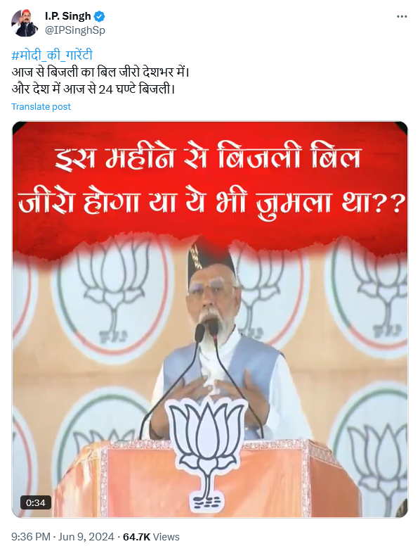 | 1. पीएम मोदी ने देश में 24 घंटे मुफ्त बिजली का वादा नहीं किया | पीएम मोदी ने अपने तीसरे कार्यकाल में बिजली मुफ्त करने का वादा किया था। | पीएम ने पूरे देश में 24 घंटे मुफ्त बिजली देने का कोई वादा नहीं किया था। वायरल वीडियो एडिटेड है। |