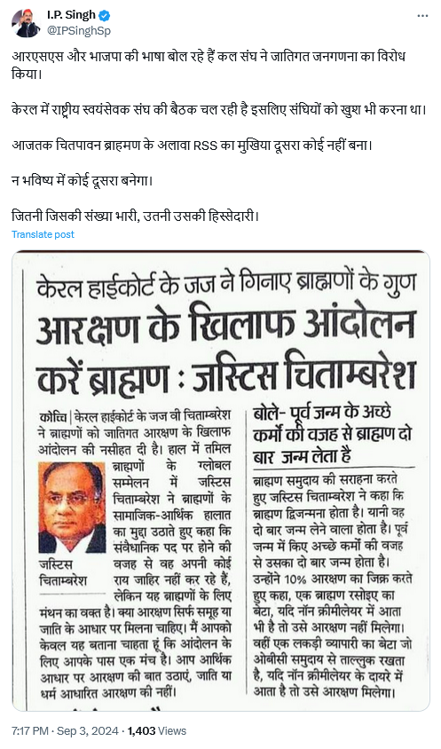 | 28. आरक्षण पर जस्टिस चितंबरेश का वायरल बयान 5 साल पुराना | जस्टिस चितंबरेश ने कहा कि आरक्षण के खिलाफ आंदोलन करे ब्राम्हण। | वायरल अखबार की कटिंग 5 साल पुरानी है। जस्टिस चितंबरेश ने यह बयान केरल में ब्राह्मण सभा के एक कार्यक्रम में दिया था। इसका मौजूदा वक्त में राष्ट्रीय स्वयंसेवक संघ की बैठक से लेना देना नहीं है। |