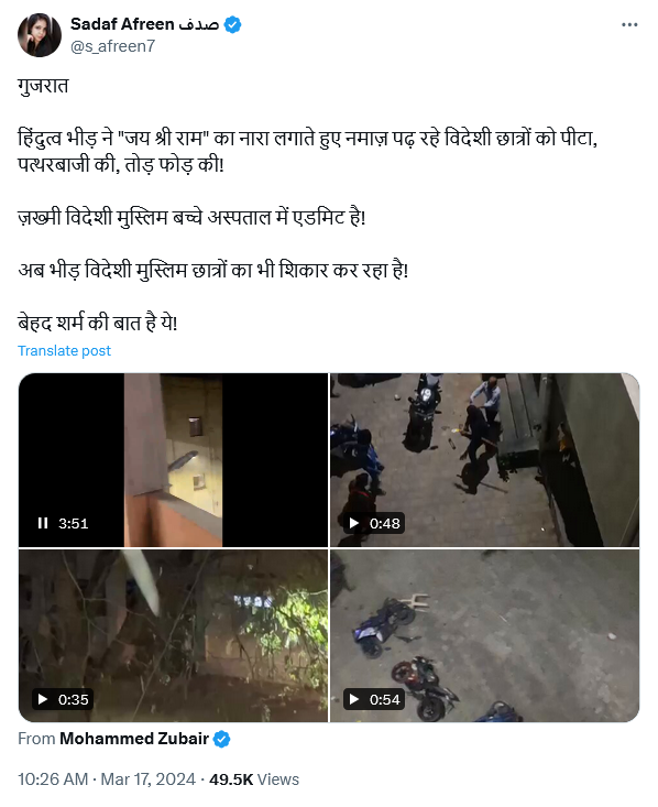 | 25. गुजरात युनिवर्सिटी में लोगों ने नमाज पढ़ते वक्त विदेशी मुस्लिम छात्रों को पीटा? | गुजरात हिंदुत्व भीड़ ने “जय श्री राम” का नारा लगाते हुए नमाज़ पढ़ रहे विदेशी छात्रों को पीटा। | खुले आसमान के नीचे नमाज पढ़ने के सवाल पर विदेशी मुस्लिम छात्र ने पहले हमला किया था। इस दौरान न कोई धार्मिक नारा लगा, न ही किसी ने मुस्लिम छात्र से अभद्रता की थी। |
