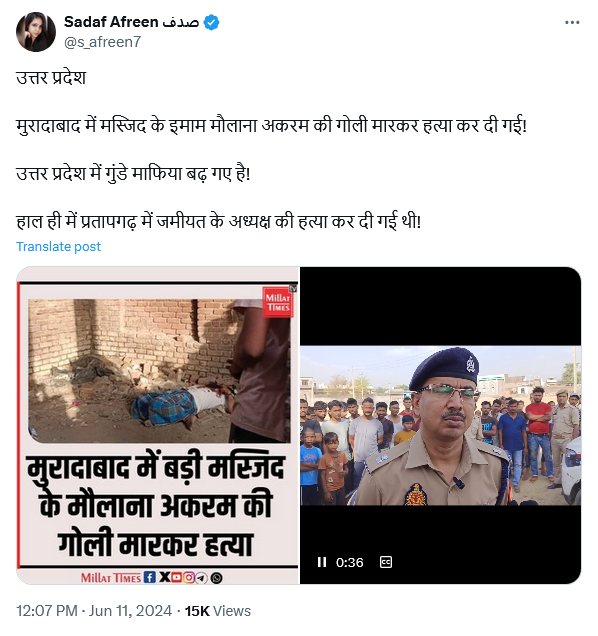 | 42. मुरादाबाद में इमाम अकरम की नहीं हुई थी हत्या, सांप्रदायिक एंगल का दावा भी झूठा | उत्तर प्रदेश मुरादाबाद में मस्जिद के इमाम मौलाना अकरम की गोली मारकर हत्या कर दी गई। | यूपी के मुरादाबाद में इमाम की हत्या का दावा गलत है। दरअसल इमाम दूसरी शादी करना चाहता था लेकिन घर में इसे लेकर विवाद था। इसी वजह से इमाम ने आत्महत्या कर ली। |