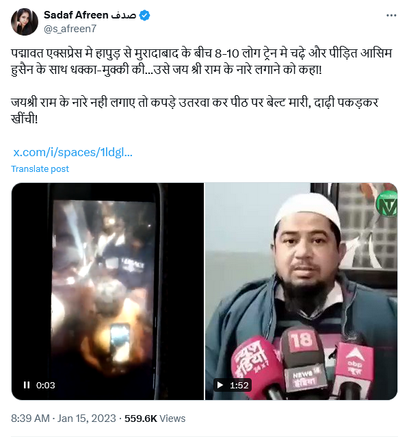 | 1. ट्रेन में ‘जय श्री राम’ न बोलने पर मुस्लिम कारोबारी को नहीं पीटा गया | पद्मावत एक्सप्रेस में 8-10 लोगों ने ट्रेन में आसिम हुसैन को जय श्री राम के नारे लगाने को कहा। नारे नहीं लगाने पर मारपीट की और दाढ़ी खीची। | आसिम हुसैन ने ट्रेन में एक महिला से छेड़छाड़ की थी, जिसके चलते लोगों ने उसकी पिटाई की थी। ट्रेन में ‘जय श्री राम’ के नारे लगाने जैसी कोई घटना नहीं हुई थी। |