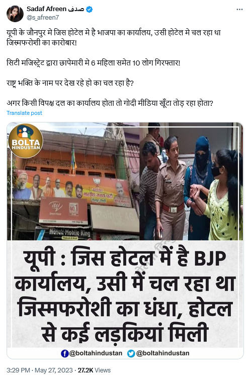 | 6. जौनपुर बीजेपी कार्यालय में सेक्स रैकेट चलने का दावा भ्रामक | यूपी के जौनपुर मे जिस होटेल मे है भाजपा का कार्यालय, उसी होटेल मे चल रहा था जिस्मफरोशी का कारोबार। | बिल्डिंग के फर्स्ट फ्लोर पर बीजेपी का दफ्तर था, यह दफ्तर कई महीनों से बंद पड़ा था। वहीं होटल ग्राउंड फ्लोर पर मौजूद था। इसका बीजेपी से कोई लेना देना नहीं था। |